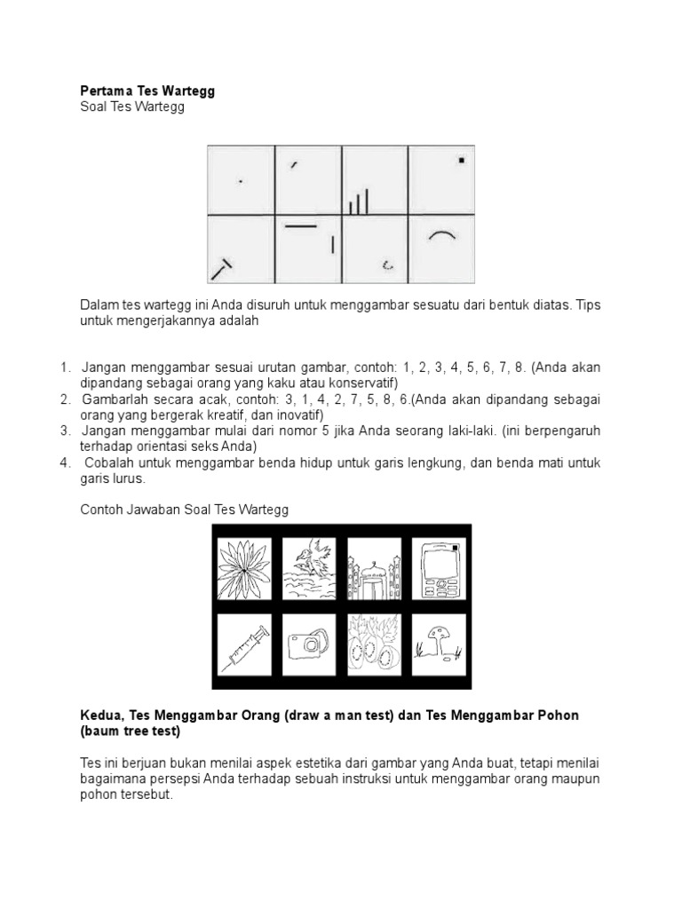 Tes Wartegg from imgv2-2-f.scribdassets.com Sejarah wartegg test tertuang dalam artikel yang terbit di gestalt theory. Contoh soal dan gambar tes psikotes wartegg. Karena jika anda menggambar berdasarkan urutan gambar 1,2,3,4,5,6,7,8. Sebaiknya pada tes wartegg ini anda menggambar secara acak dan tidak berdasarkan nomor urut sesuai gambar, misalnya 1,2,3,4 kemudian 8,7,6,5. Tes wartegg pada sebuah perusahaan tertentu dalam melakukan proses perekrutan terhadap karyawan baru akan memberikan suatu pelatihan tertulis berupa soal soal tertentu test untuk mengukur seberapa dalam kemampuan yang dimiliki karyawan baru tersebut dan seberapa pantas untuk dapat bekerja pada perusahaan itu. Berikut ini merupakan contoh soal tes wartegg. 3 soal psikotes tersulit yang bisa menyebabkan anda gagal lolos seleksi kerja. Jual icel3.org soal tes psikometri mmpi 2 dan jawaban pdf tes wartegg adalah salah satu contoh tes psikotes/psikometri yang.